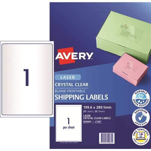 AVERY L7567 CLEAR LASER LABELS LABELS Quick Peel 1/Sht 25Shts 199.6x289.1mm