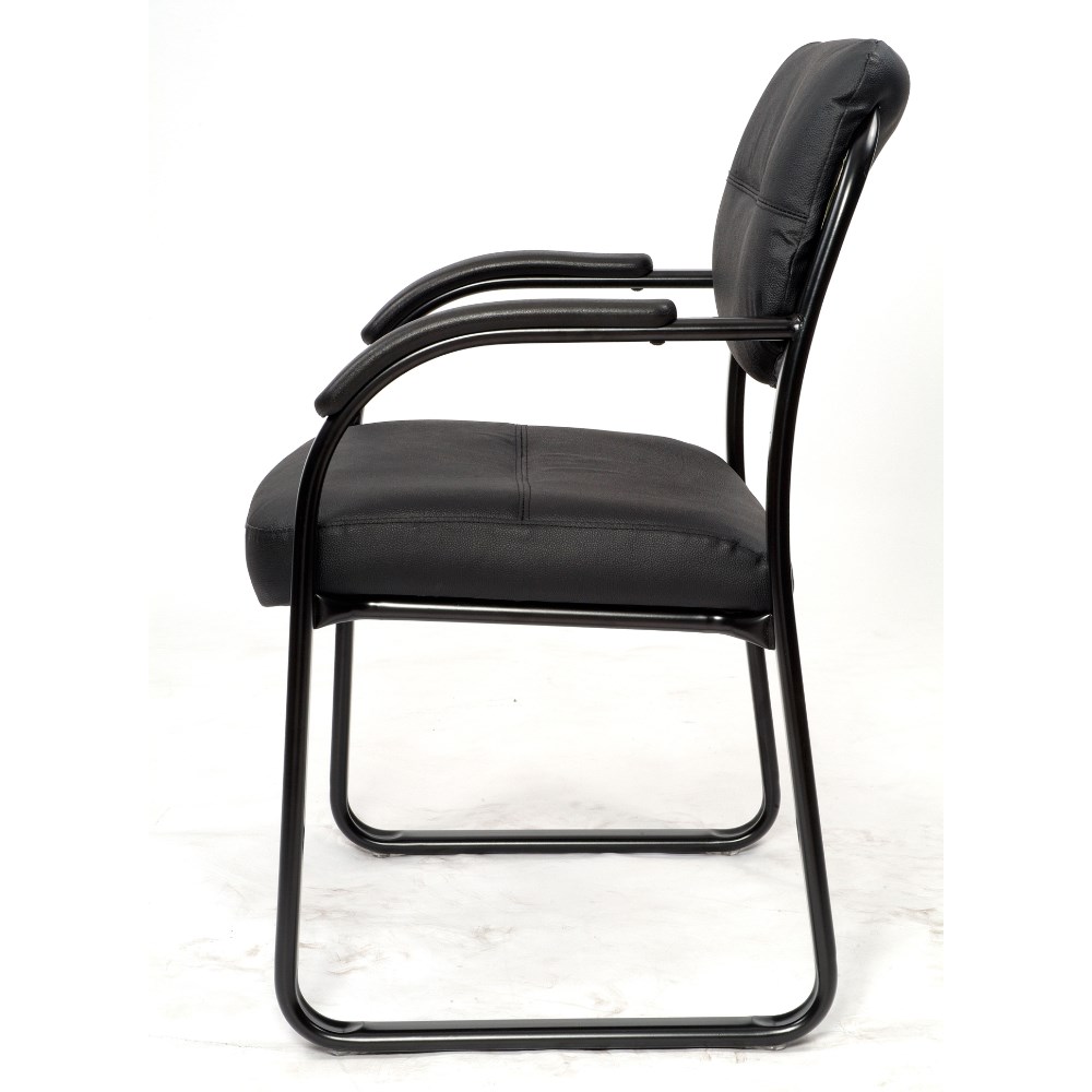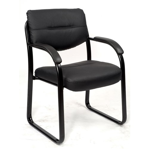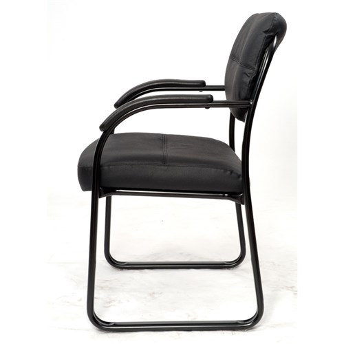 Corkman Visitor Chair Black Steel Frame Padded Arm Rests Black Leather Seat and Back