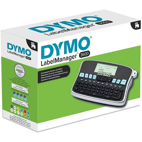 • Includes LabelManager™ 360D Label Maker, rechargeable Lithium-ion battery, charging adapter, D1 starter label cassette black on white 19mm x 3m.