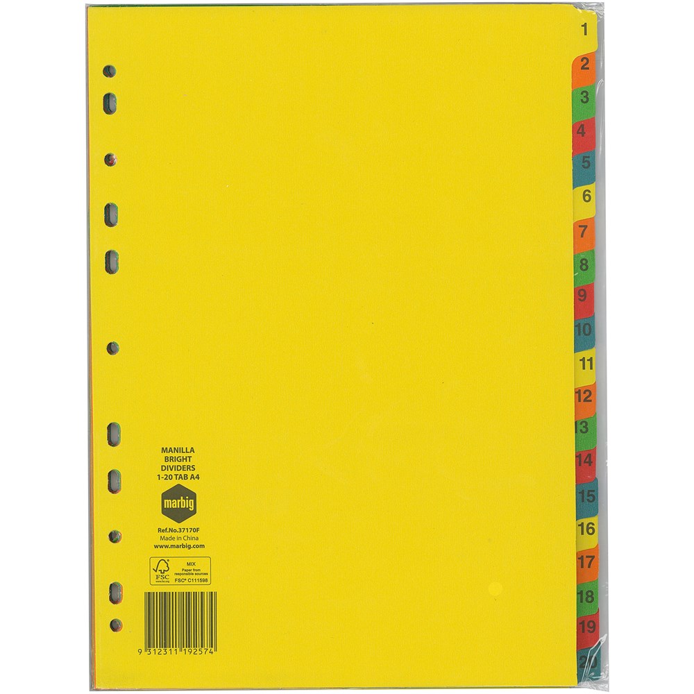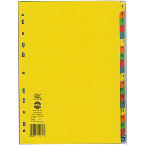 MARBIG BRIGHT MANILLA DIVIDERS A4 1-20 Multi-Coloured