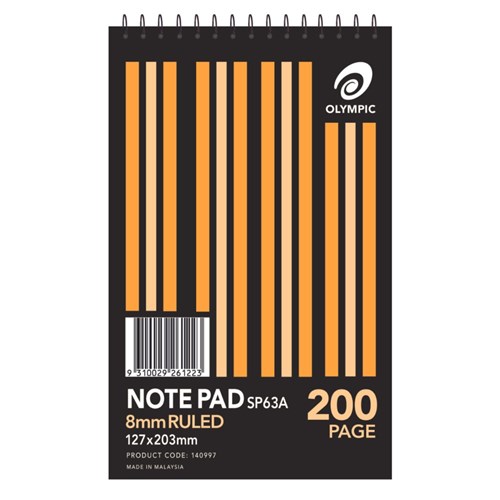 OLYMPIC SPIRAL NOTEBOOK SP63A 200Pg 127x203 8mm Ruled T/Open
